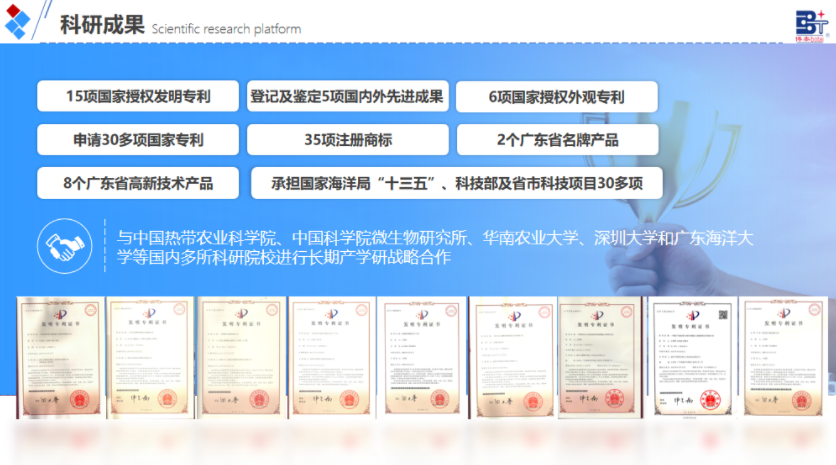 截至目前,公司累計(jì)承擔(dān)國家重點(diǎn)研發(fā)計(jì)劃 “藍(lán)色糧倉” 專項(xiàng)、國家海洋局 “十三五” 專項(xiàng)等國家及省市科研項(xiàng)目 30 余項(xiàng),獲授權(quán)國家專利 30 余項(xiàng)(其中發(fā)明專利 17 項(xiàng)) ,主導(dǎo)制定 3 項(xiàng)團(tuán)體標(biāo)準(zhǔn),擁有肥料登記證近 20 個(gè),產(chǎn)品通過有機(jī)認(rèn)證、綠色認(rèn)證,并獲評 “國家重點(diǎn)新產(chǎn)品”“廣東省知名品牌”。